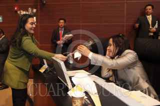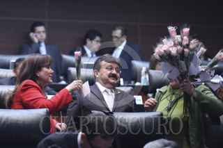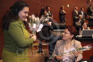 MÉXICO, D.F., 08MARZO2012.- Senadoras reciben flores durante la sesión ordinaria de la Cámara Alta. Las rosas rosas fueron entregadas en el marco del Día Internacional de la Mujer, en la foto, la senadora Yeidckol Polevnsky recibe el presente. FOTO: CUARTOSCURO.COM