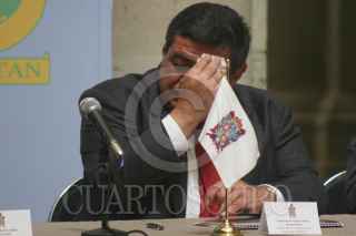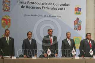OAXACA, OAXACA 08MARZO2012.- Alejandro Poiré, secretario de Gobernación signo este jueves en el Palacio de Gobierno de Oaxaca junto con los gobernadores de Oaxaca, Tabasco y Campeche, Gabino Cué, Andrés Granier Melo y Fernando Ortega Bernés, respectivamente la Firma Protocolaria de Convenios de Recursos Federales 2012 que para este año transferirá 17 mil 311 millones de pesos a entidades de todo el país, incluyendo a las de la Zona Sur-Sureste, integrada por Oaxaca, Guerrero, Chiapas, Campeche, Tabasco, Quintana Roo y Yucatán. FOTO: ARTURO PÉREZ ALFONSO /CUARTOSCURO.COM