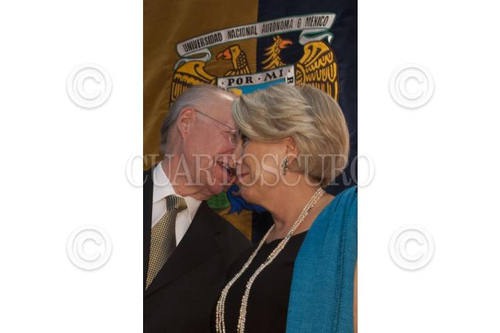 MÉXICO D.F., 09MARZO2012.- El escritor Ignacio Solares saluda a la Dra. María Teresa Uriarte, titular de Difusión Cultural UNAM al finalizar el acto de entrega del Doctor Honoris Causa a la familia Monsiváis de manos del rector de la UNAM; José Narro. FOTO: FRANCISCO RODRÍGUEZ /CUARTOSCURO.COM