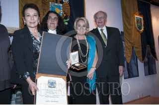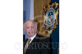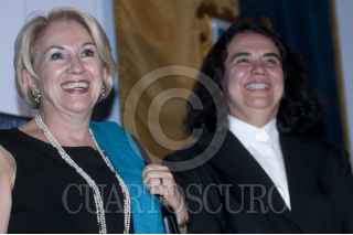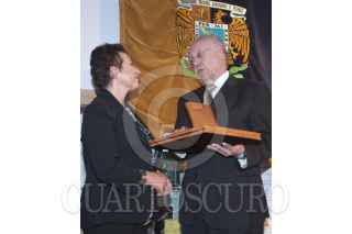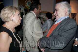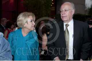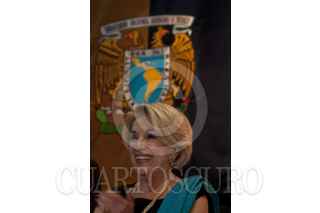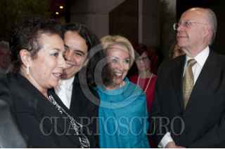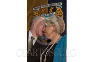 MÉXICO D.F., 09MARZO2012.- El escritor Ignacio Solares saluda a la Dra. María Teresa Uriarte, titular de Difusión Cultural UNAM al finalizar el acto de entrega del Doctor Honoris Causa a la familia Monsiváis de manos del rector de la UNAM; José Narro. FOTO: FRANCISCO RODRÍGUEZ /CUARTOSCURO.COM