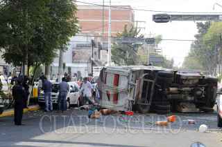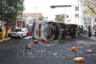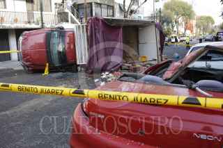 MÉXICO, D.F., 10MARZO2012.- Una mujer de aproximadamente 25 años perdió la vida tras un accidente vehicular en el que se vieron involucrados una camioneta de 3 1/2 y una camioneta de la Policía Federal. Esto sucedió en el cruce de Eje 4 Sur Xola e Isabel La Católica en la colonia Avante. Tras el impacto la unidad que transportaba verduras aplastó a un auto Focus que se encontraba estacionado. Al lugar arribaron peritos de la Delegación Benito Juárez para tomar conocimiento de los hechos. FOTO: LUIS CARBAYO /CUARTOSCURO.COM
