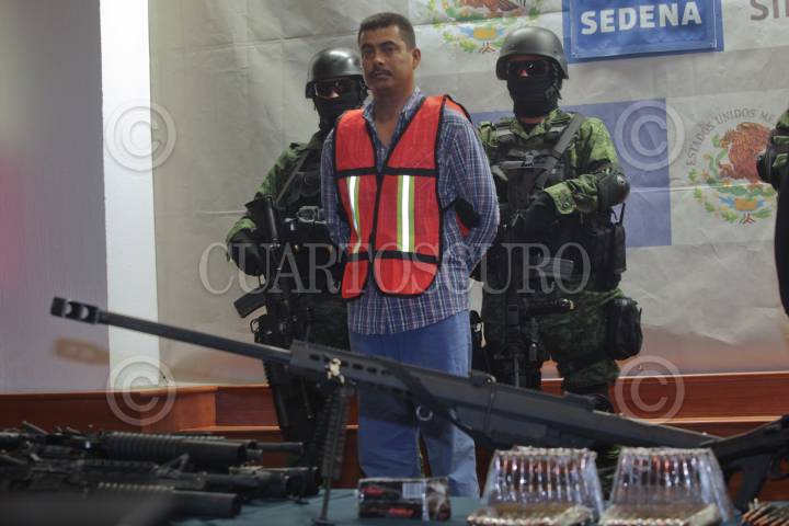 MÉXICO, DF 12MARZO2012.- Al presentar a Érick Valencia Salazar,"El 85", y sus presuntos cómplices Otoniel Mendoza, "Tony Montana", y José Luis Salazar Gutiérrez, "El Chelis", la PGR informó que ha solicitado una orden de arraigo de 40 días contra los implicados y que está por ser resuelto en las próximas horas. En el lugar fueron aseguradas seis armas cortas, 37 largas, incluidos 19 fusiles AR-15 con aditamento lanzagranadas, dos ametralladoras y dos fusiles Barret. También tres granadas, 119 cargadores, 69 mil cartuchos, tres silenciadores, equipo de comunicación, vestuario apocrifo de la Policia Estatal de Jalisco. FOTO: JUAN PABLO ZAMORA /CUARTOSCURO.COM