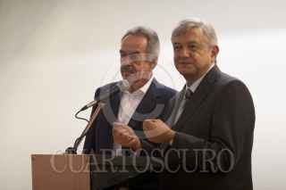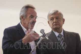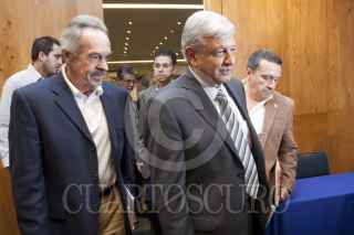 MÉXICO, D.F., 12MARZO2012.- Andrés Manuel López Obrador precandidato del Movimiento Progresista (PRD, PT y MC) presento a René Druker Colín investigador de la UNAM, como posible Secretaría de Ciencia, durante Foro de Educación, Ciencia y Tecnología, que se realiza en un conocido hotel de la colonia Nápoles. FOTO: GUILLERMO PEREA /CUARTOSCURO.COM
