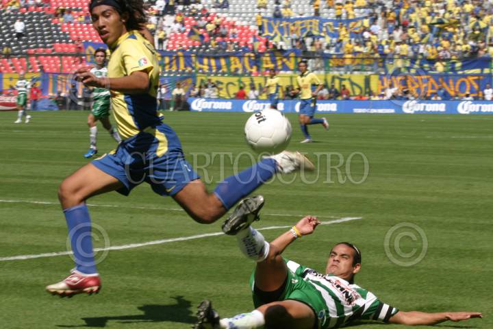 MEXICO, D.F. 30ENERO2005.- Mario Pérez (América), disputó un balón con Héctor Altamirano (Santos) en el partido donde las águilas del América vencieron 4 goles a 2 a Santos Laguna en la jornada 3 del torneo de clausura 2005. FOTO: Iván Stephens/CUARTOSCURO.COM