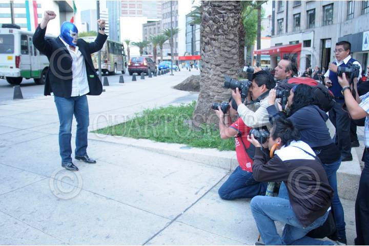 MÉXICO, D.F. 13MARZO2012.- El luchador Blue Demon Jr. ofreció una conferencia de prensa la tarde de hoy, para anunciar su participación en la marcha por la paz y la organización ciudadana contra la delincuencia el próximo 18 de Marzo a las 10 hrs del Angel al Zócalo capitalino. El hijo de Blue Demon aseguro que solo la organización y la defensa de la paz social individualmente y atraves de redes de auxilio alejará a los delincuentes de las calles. FOTO: FRANCISCO RODRIGUEZ /CUARTOSCURO.COM