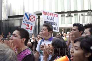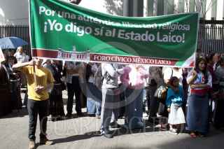 MÉXICO, D.F., 14MARZO2012.- Integrantes de organizaciones laicas realizaron una manifestación afuera de la nueva sede del Senado, donde las comisiones de Puntos Constitucionales y de Estudios Legislativos analizan las reformas a los artículos 24 y 40 de la Constitución. Al interior de la sede senatorial, las comisiones iniciaron el análisis de los cambios al artículo 40 de la Carta Magna, que reafirma el carácter laico del Estado mexicano, para tratar de aprobar el dictamen respectivo. FOTO: MOISÉS PABLO /CUARTOSCURO.COM