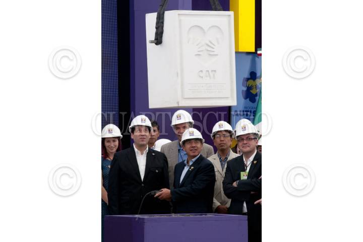 ECATEPEC ESTADO DE MÉXICO, 15MARZO2012.- El Obispo de Ecatepec, Onesimo Cepeda se coloca el casco para bajar la primera piedra del Centro Autista Teletón que se construira en este municipio. El presidente Felipe Calderón fue el orador principal. FOTO: FRANCISCO RODRÍGUEZ /CUARTOSCURO.COM