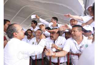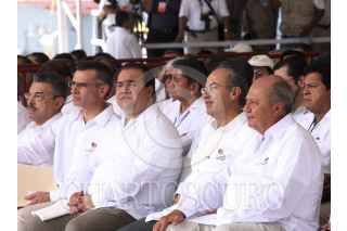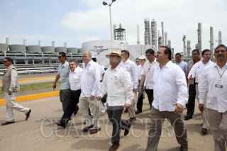 COATZACOALCOS, VERACRUZ, 18 DE MARZO DEL 2012.- Felipe Calderón, Presidente de la República, durante el 74 aniversario de la Expropiación Petrolera, entregó la Planta Rereformadora Nafta, en el complejo Petroquímico "La Cangrejera". En la foto esta flanqueado, a su derecha, por el gobernador de Veracruz, Javier Duarte, y a su Izquierda, por el priista Carlos Romero Deschamps, líder sindical de los Petroleros. FOTO: ALFREDO GUERRERO /CUARTOSCURO.COM