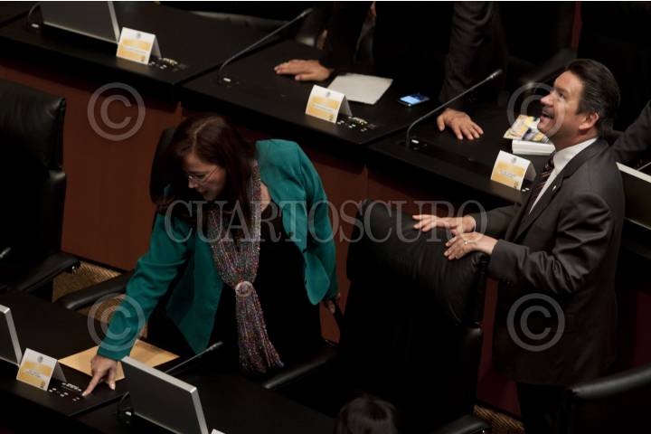 MÉXICO, D.F., 20MARZO2012.- Los senadores del PRD, Yeidckol Polevnsky Gurwitz y Carlos Navarrete durante el inicio de sesión ordinaria en el Senado de la República. FOTO: RODOLFO ANGULO /CUARTOSCURO.COM