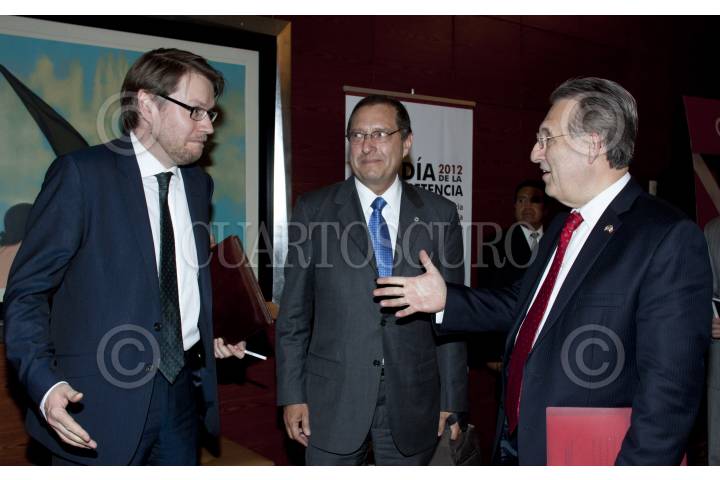 MÉXICO, D.F., 21MARZO2012.- El Ministro Consejero de Comercio e Inversión de la Embajada Británica en México, Justin Mckenzie bromea con el Embajador de los Estados Unidos en México, Anthony Wayne la mañana de hoy antes de su participación en el Foro, Día de la Competencia 2012 "Impulsando la eficiencia y la competencia en las compras de Gobierno" FOTO: FRANCISCO RODRÍGUEZ /CUARTOSCURO.COM