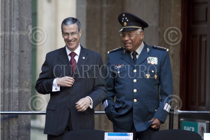 MÉXICO, D.F., 21MARZO2012.- Francisco Saynez, secretario de Marina ; Alejandro Poire, secretario de Gobernación; Juan Silva Meza, ministro presidente de la Suprema Corte de Justicia de la Nación y el presidente Felipe Calderón durante la ceremonia del CCVI aniversario del natalicio de Benito Juarez que se realizo en el Patio Mariano de Palacio Nacional. FOTO: RODOLFO ANGULO /CUARTOSCURO.COM