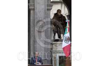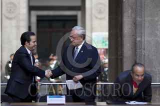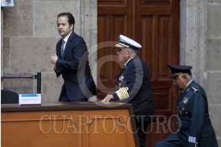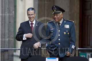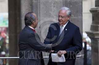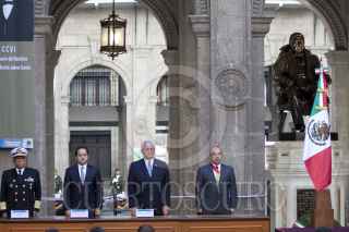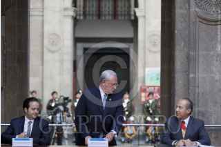 MÉXICO, D.F., 21MARZO2012.- Francisco Saynez, secretario de Marina ; Alejandro Poire, secretario de Gobernación; Juan Silva Meza, ministro presidente de la Suprema Corte de Justicia de la Nación y el presidente Felipe Calderón durante la ceremonia del CCVI aniversario del natalicio de Benito Juarez que se realizo en el Patio Mariano de Palacio Nacional. FOTO: RODOLFO ANGULO /CUARTOSCURO.COM