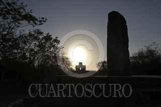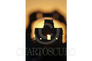 DZIBILCHALTÚN, YUCATÁN, 21MARZO2012.- El dios Kin se hizo presente en la piramide de las siete muñecas en la zona arqueológica de Dzibilchaltún para marcar el inicio de la primavera, ante miles de espectadores que se dieron cita en la legendaria ciudad maya. Poco antes de las seis de la mañana el astro rey se presento en la puerta central de la piramide. FOTO: FRANCISCO BALDERAS /CUARTOSCURO.COM