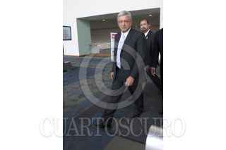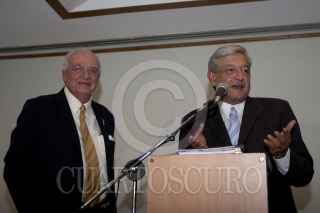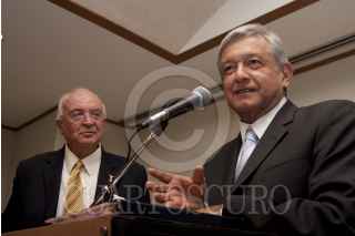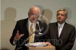 MÉXICO, D.F., 22MARZO2012.- Andrés Manuel López Obrador, candidato de la coalición Movimiento progresista, acompañado por el abogado, José Agustín Ortiz Pinchetti, a quien propuso como su secretario del trabajo durante una conferencia de prensa. FOTO: GUILLERMO PEREA /CUARTOSCURO.COM