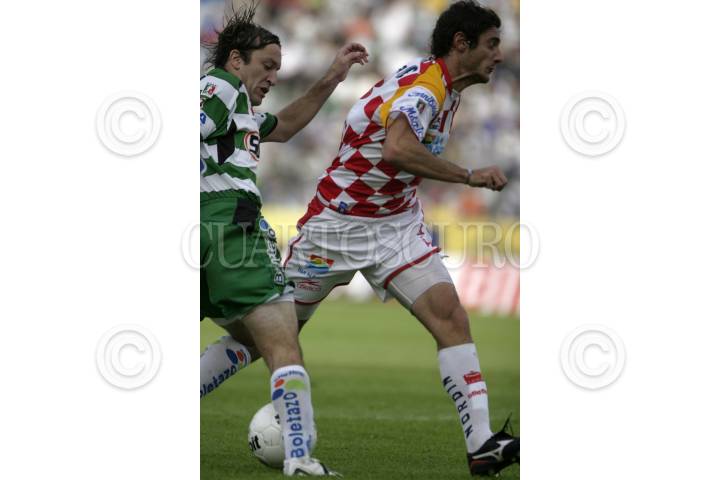 TORREÓN, COAHUILA 06FEBRERO2005.- Hugo Norberto Castillo (Santos) disputó un balón con el jugador de Tecos en el juego donde Santos laguna derrotó 4 goles a 2 a Tecos de la U. de G. en la jornada 4 del torneo de clausura 2005 disputado en el estadio Corona. FOTO: Jorge López/CUARTOSCRO.COM