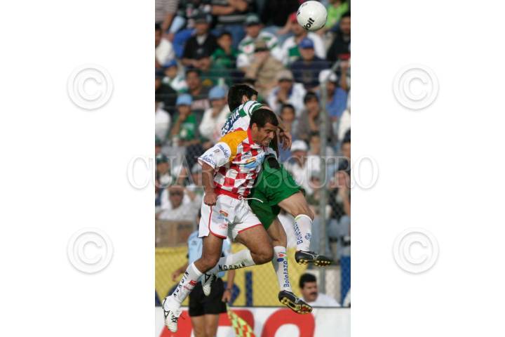 TORREÓN, COAHUILA 06FEBRERO2005.- Hugo Norberto Castillo (Santos) disputó un balón con el jugador de Tecos en el juego donde Santos laguna derrotó 4 goles a 2 a Tecos de la U. de G. en la jornada 4 del torneo de clausura 2005 disputado en el estadio Corona. FOTO: Jorge López/CUARTOSCRO.COM