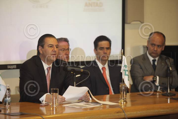 MÉXICO, D.F., 26MARZO2012.- Fernando Solís Soberón, presidente de la Asociación Mexicana de Instituciones de Seguros (AMIS), y Juan Carlos Cortes García, presidente del Consejo Nacional Agropecuario ( CNA), durante el Informe en el que los integrantes del Consejo Coordinador Empresarial darán a los candidatos presidenciales en reuniones con cada uno, titulado "Agenda única para desarrollo de México." FOTO: JUAN PABLO ZAMORA /CUARTOSCURO.COM