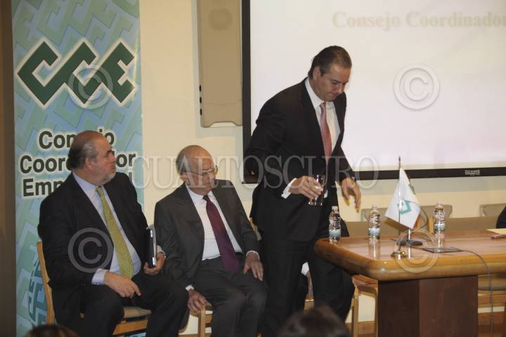 MÉXICO, D.F., 26MARZO2012.- Fernando Solís Soberón, presidente de la Asociación Mexicana de Instituciones de Seguros (AMIS), y Juan Carlos Cortes García, presidente del Consejo Nacional Agropecuario ( CNA), durante el Informe en el que los integrantes del Consejo Coordinador Empresarial darán a los candidatos presidenciales en reuniones con cada uno, titulado "Agenda única para desarrollo de México." FOTO: JUAN PABLO ZAMORA /CUARTOSCURO.COM