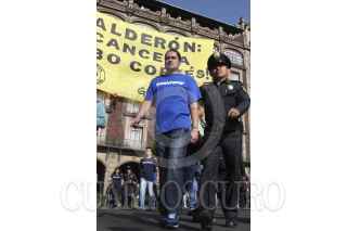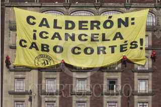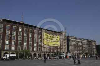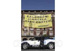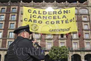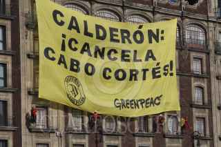 MÉXICO, D.F., 27MARZO2012.- Integrantes de la organización ambientalista Greenpeace, desplegaron una manta en un hotel ubicado a un costado de la calle de madero con vista a Palacio Nacional donde le piden a Felipe Calderón, Presidente de México cancele el proyecto de Cabo Cortes ya que en la zona se encuentra la reserva ecológica Cabo Pulmo. FOTO: ENRIQUE ORDÓÑEZ /CUARTOSCURO.COM