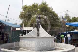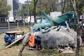 MÉXICO, D.F., 28MARZO2012.- Fuentes y esculturas aledañas a la entrada principal del Bosque de Chapultepec lucen deterioradas y en mal estado, esto provocado por el abandono de las autoridades correspondientes y por la actividad comercial irregular que se desarrolla en la zona. Como dato curiosos debajo de la escultura de grillo, icono del bosque, una persona que en situación de calle la acondiciono como su hogar. FOTO: MOISÉS PABLO /CUARTOSCURO.COM