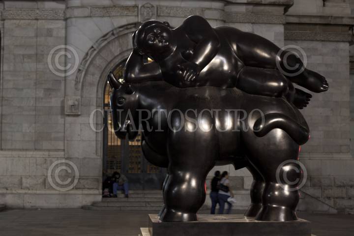 MÉXICO, D.F., 29MARZO2012.- Con la luz nocturna se acentúan la sensualidad de las formas en la esculturas de Fernando Botero que están en el patio del Palacio de Bellas Artes, las cuales forman parte de la exposición del colombiano que se encuentra en el interior del recinto. El artista ha señalado que a pesar de que mucha gente lo identifica como el "escultor de las gordas", a él solo le interesa el volumen, la proporción de las formas, la sinuosidad y sensualidad de la curvas, en su obra plástica. FOTO: MOISÉS PABLO /CUARTOSCURO.COM