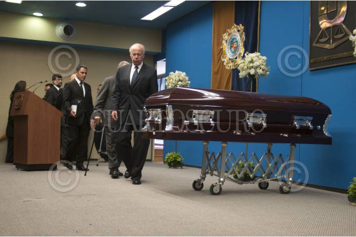 MÉXICO, D.F., 31MARZO2012.- El cuerpo del exrector, ex Secretario de Gobernación, expresidente de la Suprema Corte de Justicia y exprocurador de la República Jorge Carpizo, quien falleció el día de ayer por una complicación preoperatoria, fue homenajeado de cuerpo presente en el Auditorio del Instituto de Investigaciones Juridicas, de donde era investigador emérito. Al recinto acudieron alumnos, compañeros, exrectores y exprocuradores que le rindieron un minuto de aplausos y uan goya. FOTO: FRANCISCO RODRÍGUEZ /CUARTOSCURO.COM