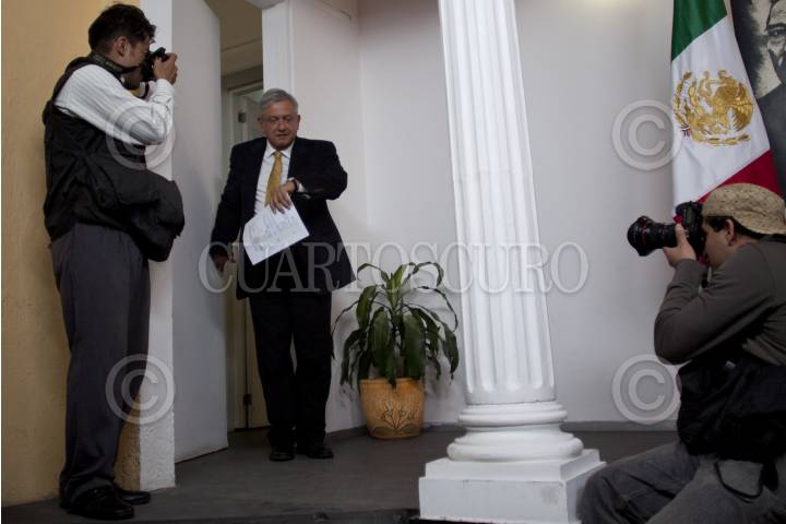 MÉXICO, D.F., 04ABRIL2012.- Andrés Manuel López Obrador, candidato a la Presidencia de la República del PT, PRD y Movimiento Ciudadano, termina su conferencia mañanera en su casa de campaña, detrás de él su inseparable César Yáñez. FOTO: MOISÉS PABLO /CUARTOSCURO.COM