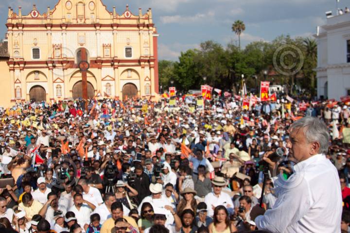 SAN CRISTÓBAL DE LAS CASAS, CHIAPAS, 04ABRIL2012.- Andrés Manuel López Obrador, candidato de las izquierdas mexicanas a la presidencia de la República, encabezó un mítin en la explanada municipal en el quinto día de su campaña. Al finalizar el evento saludó a los simpatizantes desde su vehículo conducido por Nicolás Mollinedo. FOTO: IVÁN STEPHENS /CUARTOSCURO.COM