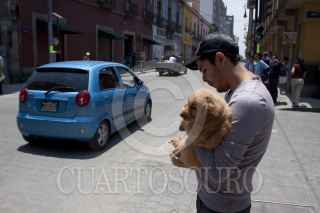 MÉXICO, D.F., 12ABRIL2012.- En la ALDF se esta trabajando para se apruebe un dictamen en el cual se modifica la Ley para la celebración de Espectáculos Públicos en el DF que propone prohibir la celebración de las corridas de toros en la Ciudad de México y el maltrato animal en general. En la imagen un joven cuida cariñosamente a su perro en el Centro Histórico. FOTO: MOISÉS PABLO /CUARTOSCURO.COM