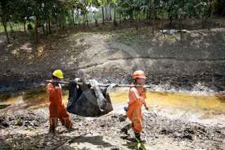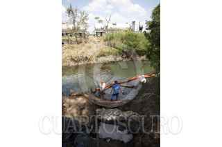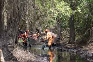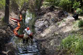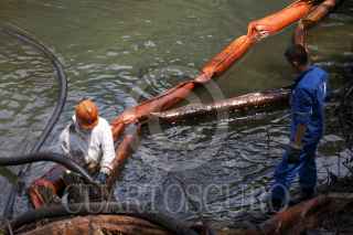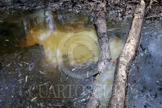 CUNDUACAN, TABASCO, 12ABRIL2012.- Continua causando daño al ecosistema el derrame de hidrocarburo sobre el arroyo El Veladero, en el cual se han vertido grandes cantidades de crudo que ocasionan desde hace siete días la ruptura en la fuga de un ducto de 24 pulgadas de diámetro en la bateria Betolla-Jujo propiedad de PEMEX, que se ubica en los alrededores del ejido Mantilla. Pobladores han señalado que el daño a tomado dimensiones alarmante en las comunidades de Ventura, Mantilla-Bellota, Santo Tomas, Felipe Carrillo, Felipito, La Chonita. El delegado de la PROFEPA Antonio Lope Baez, ha minimizado la crisis ecológica informando que el crudo solo se a esparcido en un kilómetro y medio. FOTO: MARCO POLO GUZMÁN HERNÁNDEZ/CUARTOSCURO.COM