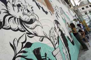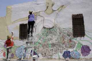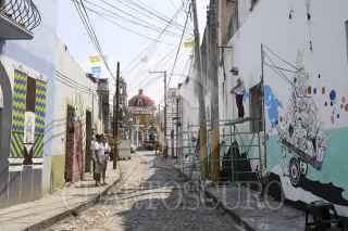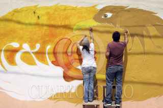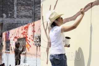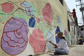 PUEBLA, PUEBLA, 12ABRIL2012.- El Colectivo Tomate, un grupo de artistas y arquitectos independientes, realizan su proyecto de pintar murales en las fachadas de las casas del barrio de Xanenetla, uno de los mas antiguos y descuidados de la ciudad con el objetivo de mejorar su imagen, involucrar a sus habitantes y convertirlo en el primer barrio-mural del país. FOTO: HILDA RÍOS /CUARTOSCURO.COM