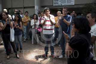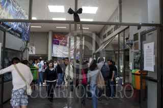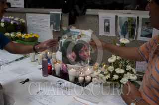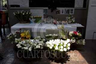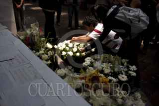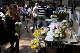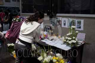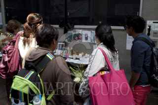 MÉXICO, D.F., 13ABRIL2012.- Con muestras de afectos los estudiantes de la facultad de Economía en la UNAM mostraron sus condolencias a las familias de los cinco compañeros que murieron el día de ayer en un accidente vehicular, el alumnado también mostró sus respetos por el profesor que pereció en el percance. Los jóvenes llevaron flores, escribieron mensajes de duelo, y les rindieron un minuto de aplausos, en el pequeño altar improvisado que se instaló en la entrada de la facultad. FOTO: MOISÉS PABLO /CUARTOSCURO.COM