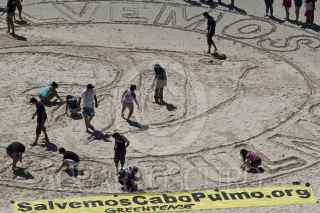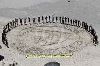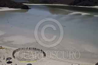 LA PAZ, BAJA CALIFORNIA, 14ABRIL2012.- Un ídolo moro, pez arrecifal que habita en la reserva marina de Cabo Pulmo, quedó plasmado en la arena de playa Balandra, una de las más concurridas en La Paz. La figura de 400 metros cuadrados fue formada por un grupo de 70 voluntarios de la organización ambientalista Greenpeace en el marco de las jornadas de votación en las principales playas de esa ciudad que tuvieron lugar este fin de semana y en las que se recolectaron más de 700 votos a favor de la conservación de Cabo Pulmo, área natural protegida ubicada en el Golfo de California y donde se pretende construir el mega complejo turístico depredador de Cabo Cortés. En la parte baja del enorme dibujo, Greenpeace colocó una manta con la dirección salvemoscabopulmo.org para invitar a la ciudadanía a que ingrese a este sitio y deje su voto electrónico, mismos que serán entregados, junto con los votos físicos, a las autoridades ambientales del país para exigir la protección de esta reserva marina considerada la más productiva de México. FOTO: GREENPEACE /CUARTOSCURO.COM