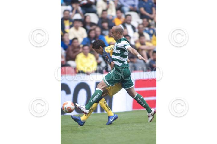 MÉXICO, D.F., 14ABRIL2012.- El número, 28, del Santos LAguna, Carlos Morales, busca arrebatar el balón al número, 11, de las Aguilas del América, Christian Benítez. En visita al Estadio Azteca, Los de la Comarca cayeron 3 goles a 1 y se quedaron con 30 puntos en la fecha 15 del Torneo Clausura 2012. FOTO: FRANCISCO RODRÍGUEZ /CUARTOSCURO.COM