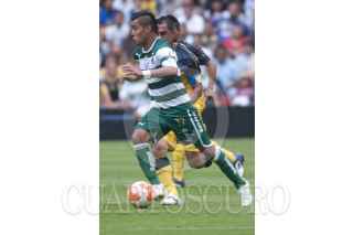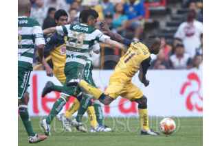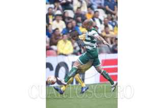 MÉXICO, D.F., 14ABRIL2012.- El número, 28, del Santos LAguna, Carlos Morales, busca arrebatar el balón al número, 11, de las Aguilas del América, Christian Benítez. En visita al Estadio Azteca, Los de la Comarca cayeron 3 goles a 1 y se quedaron con 30 puntos en la fecha 15 del Torneo Clausura 2012. FOTO: FRANCISCO RODRÍGUEZ /CUARTOSCURO.COM