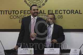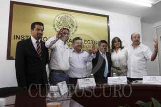 OAXACA, OAXACA, 16ABRIL2012.- Este lunes los candidatos a la diputación federal por el distrito 08 signaron un “Pacto de civilidad política y de legalidad”, lo anterior a fin de ofrecer una contienda limpia y de calidad dijeron. De derecha a izquierda, Alfonso Rule Castro del PVEM, Liz Acosta del PRI, Pedro Luis Geminiano del Panal, del Movimiento Progresista Hugo Jarquín y Rene Mejía del PAN. FOTO: ARTURO PÉREZ ALFONSO