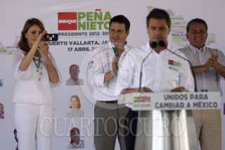 PUERTO VALLARTA, JALISCO, 17ABRIL2012.- Hoy el candidato a la presidencia de la República por el Partido Revolucionario institucional (PRI) (PVM), se reunió en un evento con ciudadanos de esta ciudad en donde hizo propuesta y firmo compromisos con los vallartenses y en donde estuvo acompañado por su esposa Angélica Rivera y el candidato a gobernador por Jalisco, Jorge Aristóteles Sandoval, el evento tuvo lugar en la Hacienda del Oro en la colonia del Pitiyal. FOTO: FERNANDO CARRANZA /CUARTOSCURO.COM