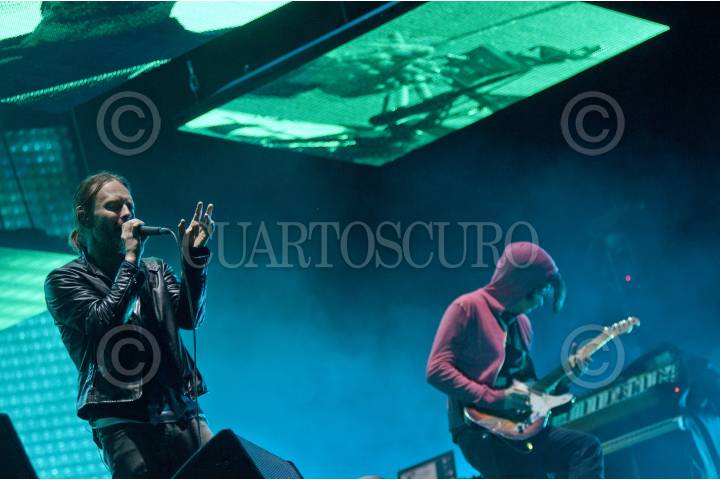 MÉXICO, D.F., 17ABRIL2012.- La banda de rock, Radio Head tocó en una noche muy lluviosa en el Foro Sol, en el primero de sus dos conciertos. La banda con una trayectoria de 15 años esta en su tercera visita, lo cual fue agradecido por el público que abarrotó el inmueble. FOTO: FRANCISCO RODRÍGUEZ /CUARTOSCURO.COM