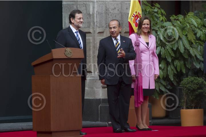 MÉXICO, D.F., 18ABRIL2012.- Felipe Calderón Hinojosa, Presidente de México, acompañado de su esposa Margarita Zavala y de integrantes de su gabinete encabezo la ceremonia de bienvenida para Mariano Rajoy Brey, Presidente del Gobierno Español en el Palacio Nacional. FOTO: GUILLERMO PEREA /CUARTOSCURO.COM