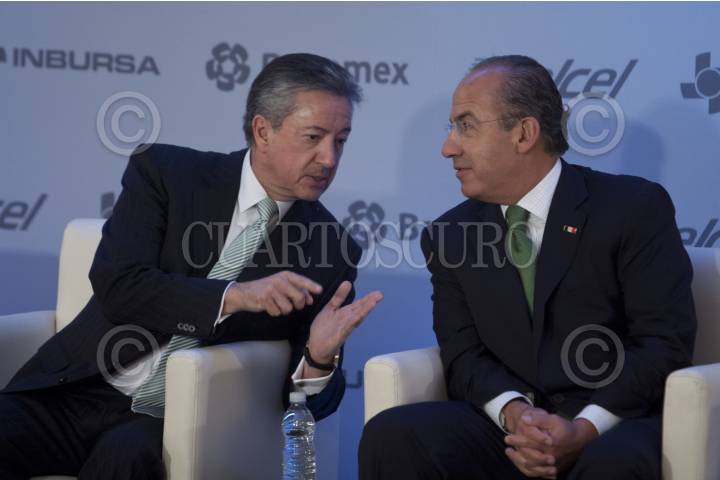 MÉXICO, D.F., 19ABRIL2012.- Irene Espinosa Cantellano, Tesorera de la Federación y el presidente Felipe Calderón durante el lanzamiento del nuevo sistema de pagos móviles denominado Transfer que se realizo en un hotel del Paseo de la Reforma. FOTO: RODOLFO ANGULO /CUARTOSCURO.COM