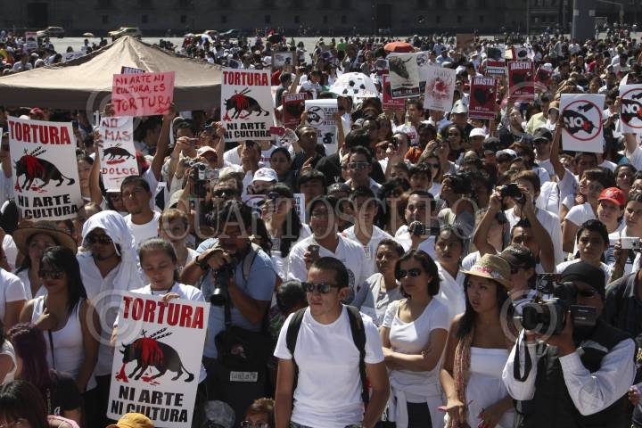 MÉXICO, D.F., 22ABRIL2012.- Cientos de personas se manifestaron contra las corridas en la plaza de toros de la ciudad de México, exigen a los diputados de la asamblea legislativa sesiones en su contra. FOTO: ENRIQUE ORDÓÑEZ /CUARTOSCURO.COM