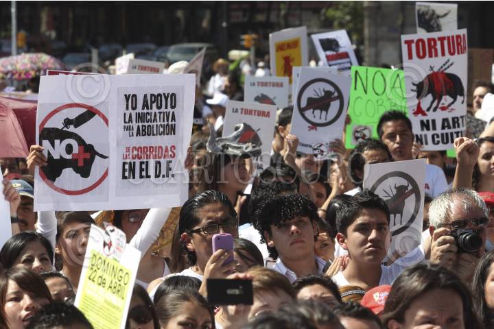 MÉXICO, D.F., 22ABRIL2012.- Cientos de personas se manifestaron contra las corridas en la plaza de toros de la ciudad de México, exigen a los diputados de la asamblea legislativa sesiones en su contra. FOTO: ENRIQUE ORDÓÑEZ /CUARTOSCURO.COM