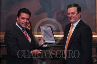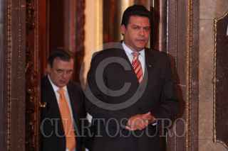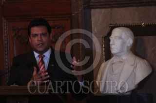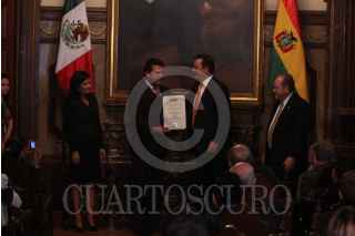 MÉXICO, D.F., 14ABRIL2012.- Marcelo Ebrard Casaubon, Jefe de Gobierno Capitalino, durante la reunión que sostuvo con el alcalde de La Paz, Bolivia, Luis Antonio Revilla, en la cual le entregó las llaves de la ciudad al que llamó un huésped distinguido. FOTO: ENRIQUE ORDÓÑEZ /CUARTOSCURO.COM