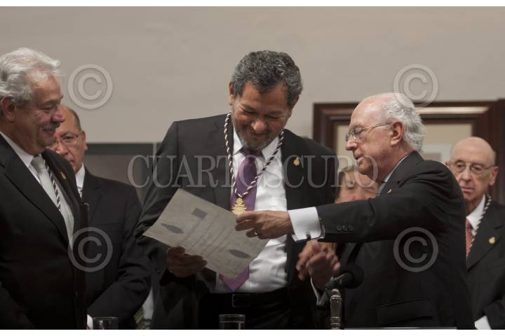 MÉXICO, D.F. 26ABRIL2012.- El escritor Xavier Velasco, autor de Diablo Guardian y el flamante miembro de la Academia Mexicana de la Lengua, el sinaloense Elmer Mendoza, dialogan al finalizar la ceremonia de ingreso que se llevó a cabo en la sala Manuel M. Ponce la noche de hoy. FOTO: FRANCISCO RODRÍGUEZ /CUARTOSCURO.COM