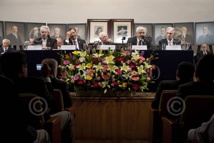 MÉXICO, D.F. 26ABRIL2012.- El escritor Xavier Velasco, autor de Diablo Guardian y el flamante miembro de la Academia Mexicana de la Lengua, el sinaloense Elmer Mendoza, dialogan al finalizar la ceremonia de ingreso que se llevó a cabo en la sala Manuel M. Ponce la noche de hoy. FOTO: FRANCISCO RODRÍGUEZ /CUARTOSCURO.COM