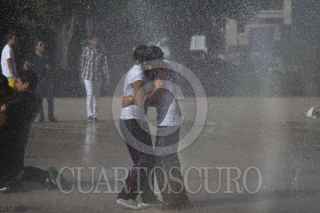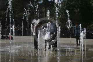 MÉXICO, D.F., 27ABRIL2012.- Estudiantes capitalinos jugando y refrescándose en las fuentes frente al Monumento a la Revolución. La Ciudad de México esta siendo afectada por una ola de calor, llegándose a registrar hasta los 35 grados centígrados en algunos puntos. FOTO:NIMROD CRUCES /CUARTOSCURO.COM