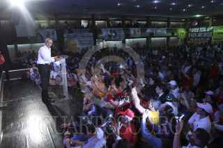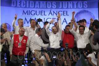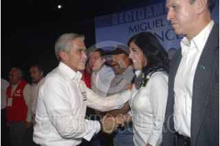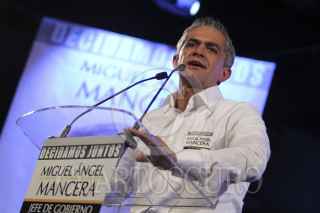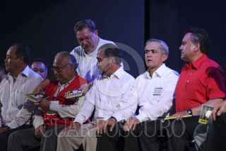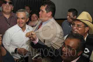 MÉXIO D.F., 01MAYO2012.- Miguel ángel Mancera, candidato de las izquierdas para la jefatura del Gobierno del Distrito Federal, se reunió miembros de diferentes sindicatos como Agustín Rodríguez Fuentes del STUNAM, Francisco Hernández Juárez del Sindicato de los Telefonistas, Martín Esparza del SME, entre otros. El escritor Paco Ignacio Taibo II, obsequia unos libros durante el cato del candidato de la izquierdas FOTO: GUILLERMO PEREA /CUARTOSCURO.COM