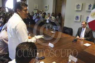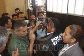 OAXACA, OAXACA, 01MAYO2012.- Momento en el que el líder de la Sección 22, Azael Santiago Chepi ingresa al Palacio de Gobierno acompañado de la Comisión Política. En dicho instante los guardias de la sede del poder Ejecutivo en Oaxaca cerraron las puertas impidiendo el acceso a trabajadores de los medios de comunicación, presionando con las puertas la cara y pierna del reportero Ismael García de periódico Noticias de la entidad, posteriormente se les permitió el acceso. FOTO: ARTURO PÉREZ ALFONSO /CUARTOSCURO.COM