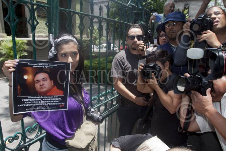 MÉXICO, D.F., 04MAYO2012.- Periodistas de diversos medios de comunicación se manifestraron en la Secretaría de Gobernación, donde entregaron un documento para exigir el esclarecimiento de los recientes asesinatos de reporteros en diversas partes del país, así como un pliego petitorio para garantizar el desarrollo del ejercicio periodístico. FOTO: JUAN PABLO ZAMORA /CUARTOSCURO.COM