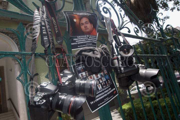 MÉXICO, D.F., 04MAYO2012.- Periodistas de diversos medios de comunicación se manifestraron en la Secretaría de Gobernación, donde entregaron un documento para exigir el esclarecimiento de los recientes asesinatos de reporteros en diversas partes del país, así como un pliego petitorio para garantizar el desarrollo del ejercicio periodístico. FOTO: JUAN PABLO ZAMORA /CUARTOSCURO.COM